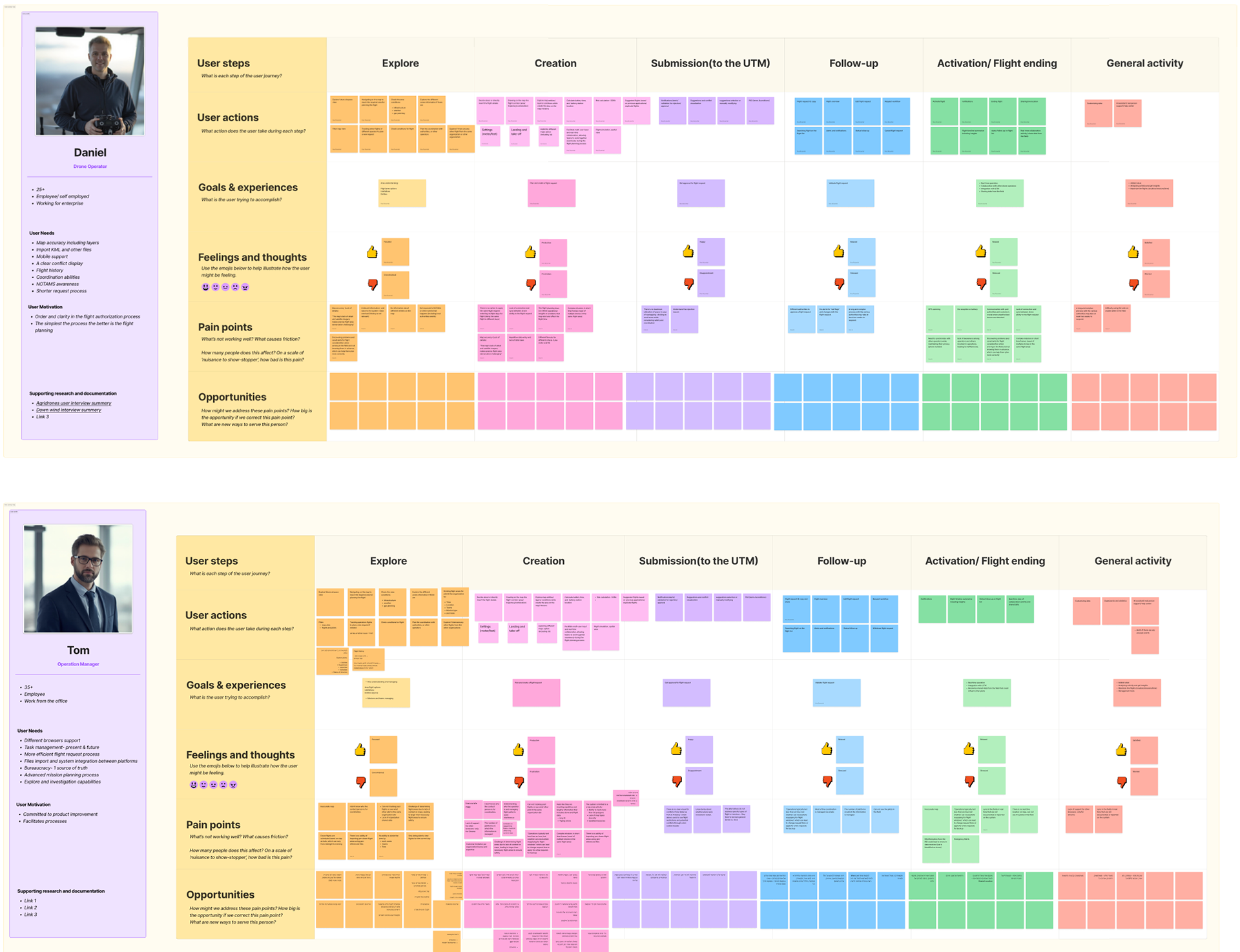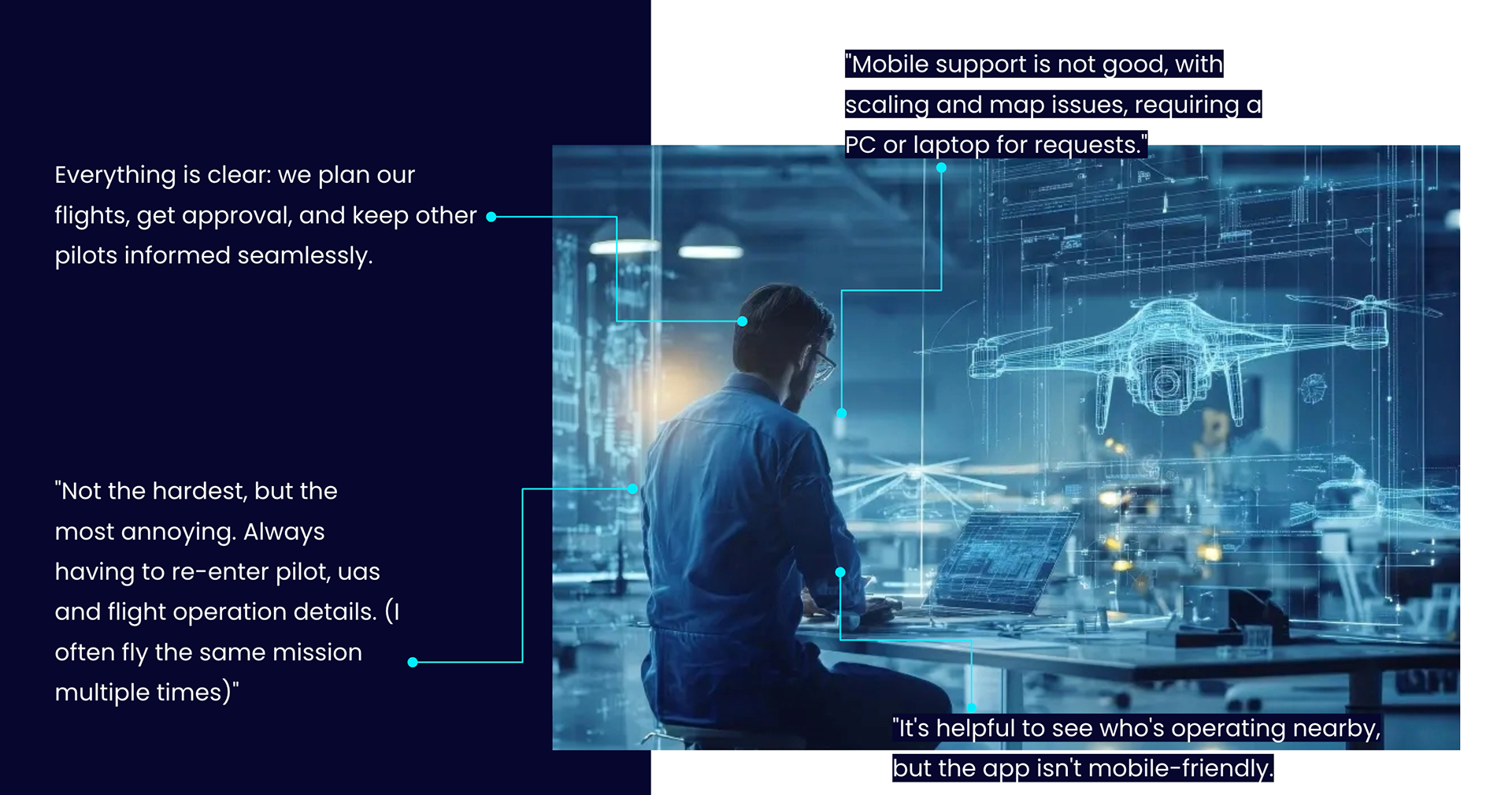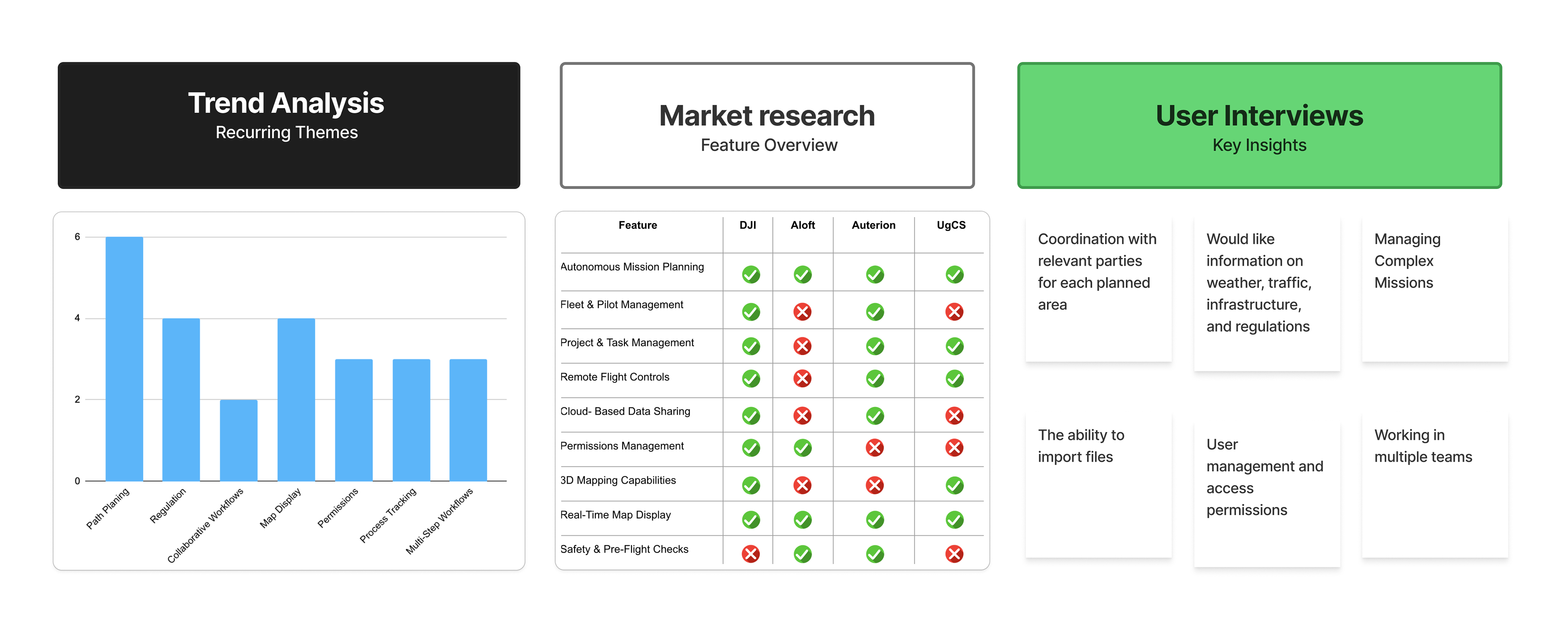 I led the initial research and distilled insights from articles, user interviews, competitors, and client feedback. These insights revealed key pain points: mission planning challenges, coordination frustrations, and opportunities for cloud-based features and improved risk management, which defined focus areas for the next design phase.