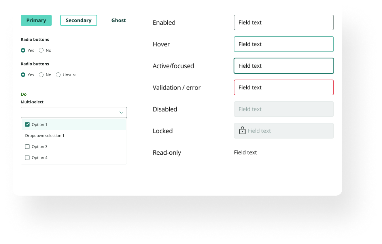 Reusable UX flows: forms, dialogs, calendars, error states, validation rules.