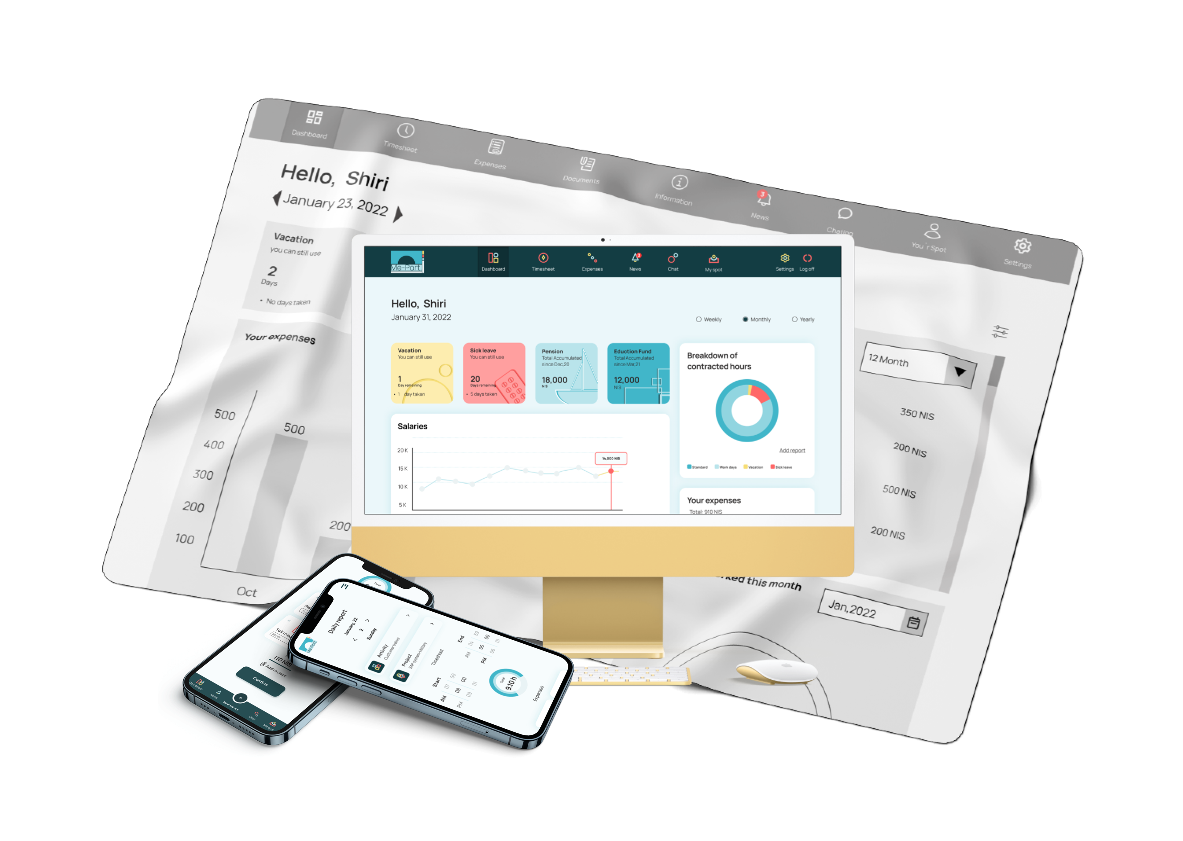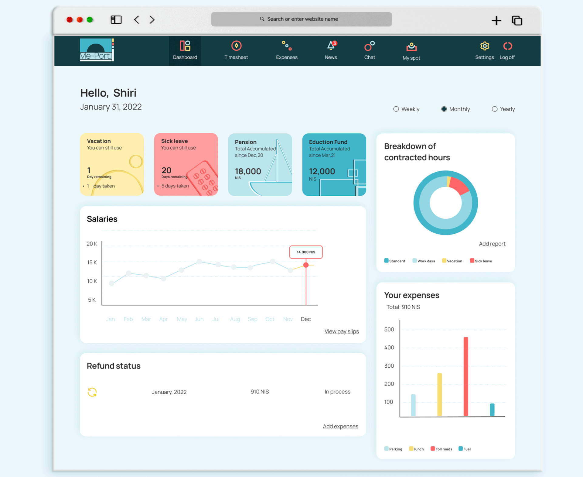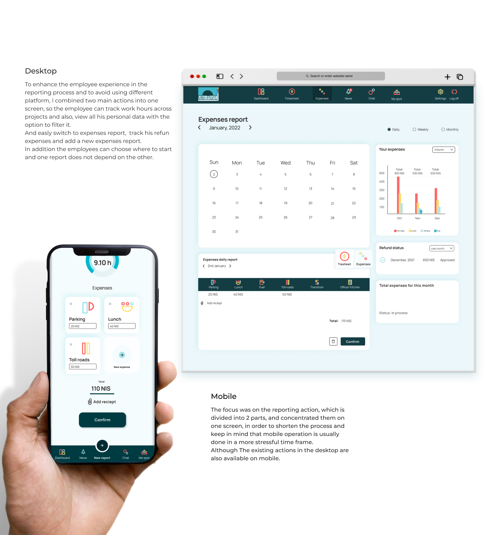Periodic reporting is crucial for employees and employers but many workplaces still use outdated software that can lead to mistakes and inefficiency. `ME PORT` simplifies the process by providing a responsive platform for workers to report and track their timesheets and expenses in one place. The platform also offers a clear and concise dashboard for easy information access.
